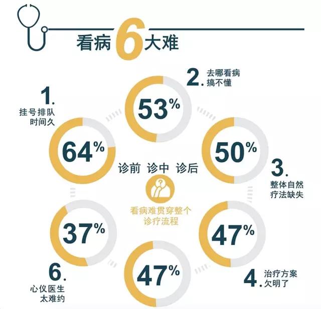 報告將目前的就醫難題總結為就醫“六大困難”和“三大情結”。“六大困難”方面,“掛號排隊時間久”居首位,超過64%的受訪對象對此頗有微詞。而“去哪看病搞不懂”、“整體自然療法缺失”、“治療方案欠明了”、“轉復診安排欠妥”和“心儀醫生太難約”則緊隨掛號難其后,共同成為最受關注的難題,讓民眾備受折磨。其中,令人略感意外的是大家對于看病方向的茫然。53%的受訪者在有病癥后搞不清楚該上哪個醫院哪個科室就醫。其中,年輕人群和低線城市人群在醫院與科室選擇上更缺乏方向性。