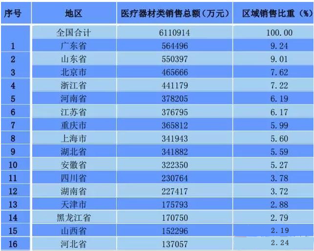 2016年,全國醫療器材類商品銷售總額約為611億元。廣東、山東為前兩大醫療器材銷售大省,北京、浙江、河南、江蘇、重慶、上海、湖北、安徽也進入了區域銷售額排行榜的前10名。