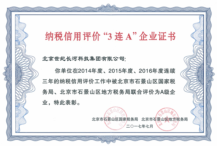 2017年7月24日,北京市石景山區(qū)納稅信用評價“3連A”企業(yè)頒證儀式暨稅銀企金融服務平臺專場活動在萬商花園酒店舉行,北京世紀長河科技集團有限公司在2014-2016年連續(xù)三年被評為A級企業(yè),獲評石景山區(qū)納稅信用評價“3連A”企業(yè)榮譽稱號。
