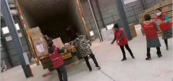 2月3日捐贈物資抵達孝感?義工正在卸載捐贈物資
