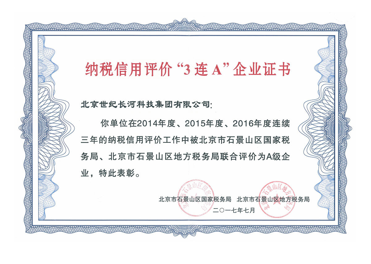 世紀(jì)長河集團獲評納稅信用“3連A”企業(yè)榮譽稱號